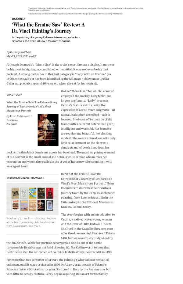 Pdf What The Ermine Saw Review A Da Vinci Painting S Journey Wsj Cammy Brothers Academia Edu